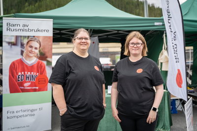 Jannike Kyllo (til venstre) representerer organisasjonen vår på Rødbergdagene for fjerde året på rad. For Anette Stenbro (til høyre) er det første gangen. Foto: Håkon Lexberg