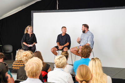 Torhild Kielland, rådgiver i Fagrådet - Rusfeltets hovedorganisasjon, sitter her sammen med Martin Eia-Revheim og Marius Sjømæling på scenen under Arendalsuka. Foto: Håkon Lexberg